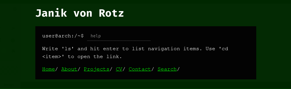 Inspired by my brothers new navigation I created my own custom navigation. In fact it is already live on my website. Once I my brother sees it, he will roll his eyes and think “What else did I expect!”. The new navigation is a terminal prompt!